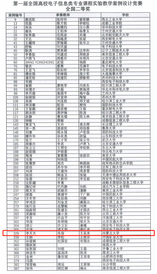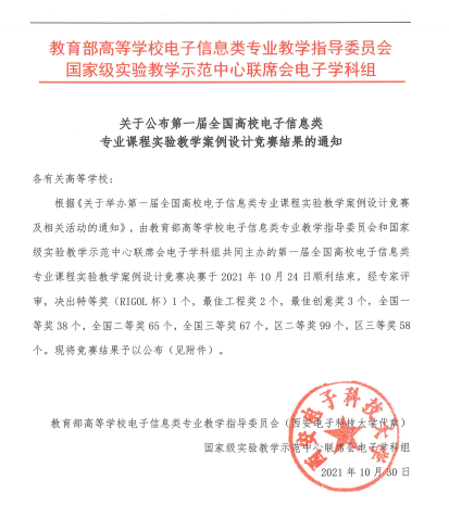 全国高校电子信息类专业课程实验教学案例设计竞赛(“RIGOL”杯)由教育部高等公司电子信息类专业教学指导委员会和国家级实验教学示范中心联席会电子学科组举办,旨在进一步推动电子信息类专业(教指委指导目录内)的专业课程相关实验或实践项目研究探索、工程实践和自主创新的改革,促进实验实践教学水平与教学质量提升,推广各高校实验教学优秀教学资源共享,激发广大教师开展实验教学建设与改革的热情。本届竞赛全国入围复赛作品共385件,最终评出国家级一等奖38项、二等奖65项和三等奖72项。