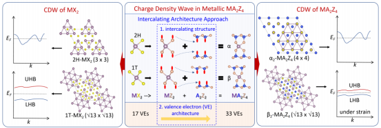 本论文提出了一种在金属MA2Z4材料中诱导与过渡金属硫族化合物中类似电荷密度波的新方法。该方法利用插层结构来保持相同的晶体场和费米面拓扑。研究表明,这些材料中的电荷密度波不稳定性是由d带和纵向声学声子之间的电子-声子耦合引起的,与过渡金属硫族化合物中的电荷密度波有相同的物理起源。通过利用临界电子-声子耦合常数将α-MA2Z41H-MX2材料结合,进而构建了半定量的电荷密度波相图。该相图证实了在具有相似晶体场的材料家族中扩展电荷密度波的可行性,并揭示了离子电荷转移和电子关联之间的竞争在电荷密度波不稳定性中的关键作用。研究进一步揭示了具有大卫星图案的β2-NbGe2N4单层中存在应变诱导的莫特转变。这项研究工作强调了插层构筑设计电荷密度波材料的潜力,扩展了对电荷密度波不稳定性和关联物理学的理解。