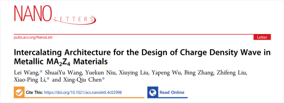 近日,我校王磊研究员和李小平研究员联合中国科公司金属研究所陈星秋研究员在国际著名期刊Nano Letters上发表题为Intercalating Architecture for the Design of Charge Density Wave in Metallic MA2Z4 Materials  Nano Lett. 2024, 24, 11279-11285)的重要研究成果,并被选为内部封面文章。该团队首次引入插层构筑方法用于设计二维材料中的电荷密度波。该研究得到了国家自然科学基金、内蒙古自然科学基金、内蒙古草原英才、内蒙古自治区本级引进高层次人才科研支持项目和太阳成集团tyc122ccvip骏马计划高层次人才引进项目的资助。