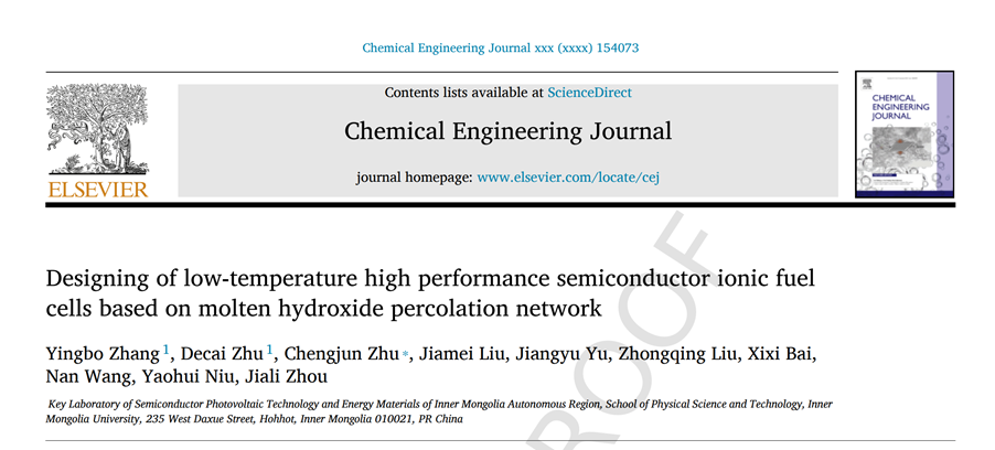 公司朱成军教授团队在国际顶级期刊《Chemical Engineering Journal》上发表了基于熔融氢氧化物渝渗网络的低温高性能半导体离子燃料电池的设计研究成果