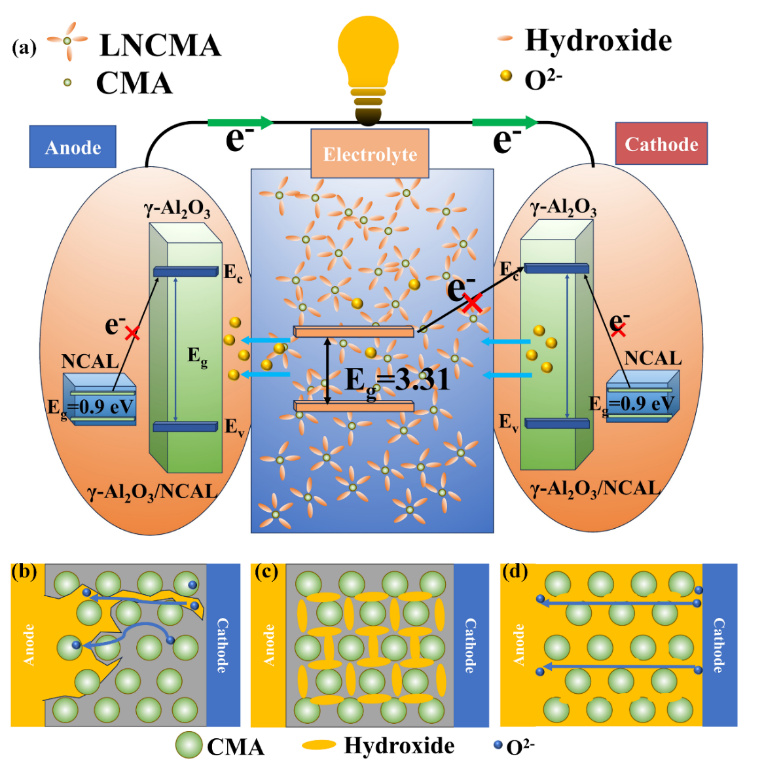 (a)γ-Al2O3/NCAL电极LNCMA电池的示意图和能带结构;(b) CMA电池;(c) 测试前LNCMA电池以及 (d) 测试后LNCMA电池中的熔融氢氧化物流动联通的渝渗模型。