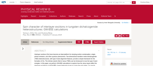 近日,太阳成集团tyc122ccvip官网入口王舒东副教授课题组,利用先进的多体微扰方法,研究了双面非对称(Janus)二维过渡金属二硫族化合物WSSe/WS2异质结构中的层间激发态性质。该研究成果以《Spin Character of Interlayer Excitons in Tungsten Dichalcogenide Heterostructures: GW-BSE Calculations》为题发表于凝聚态物理国际著名期刊Physical Review B(自然指数收录)。