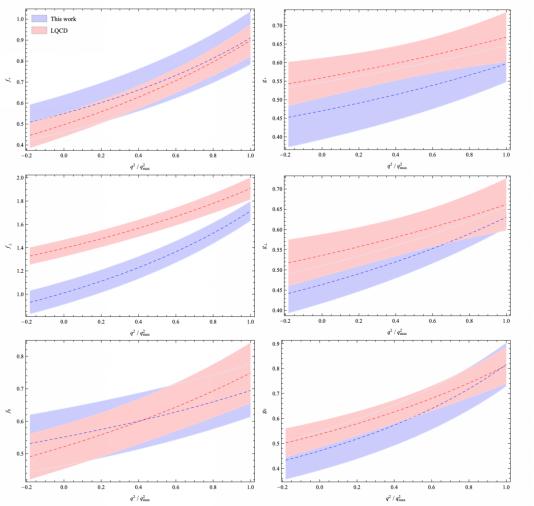 该研究得到了非常有趣的结果:计算得到的形状因子与格点QCD的结果非常接近,除了明显比格点的结果更小(图2)。这使得当把这些形状因子应用于半轻衰变分支比的计算时,得到比格点QCD预言更小、更加接近Belle实验的结果: