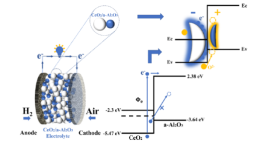 另外发现在CeO2中引入a-Al2O3能够在异质结构的复合材料中形成众多微尺度异质界面,高分辨率TEM界面分析也证实了n-i在CeO2与a-Al2O3相之间的异质结构接触。在异质结构界面处的具有超宽带隙的绝缘体a-Al2O3所引起势垒抑制了CeO2电子传导。同时,由于界面的电荷补偿,绝缘体热电效应而诱导出更多的氧空位,进一步促进了离子的输运,结果产生了更高的离子电导率和燃料电池的输出性能。本研究工作展现了一种实用的n - i异质结构复合电解质的设计方法。进一步的研究也证实了所设计构建的CeO2/a-Al2O3复合电解质的功能的先进性。这项研究工作为利用像非晶氧化铝等这类的绝缘材料开发高性能的LT-SOFCs电解质材料开辟了新的领域。