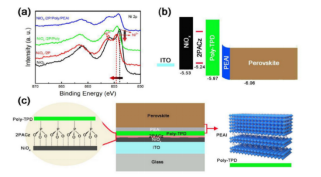 通过多层钝化NiOX HTLs(NiOX/2PACz/Poly-TPD/PEAI)的界面工程,以在NiOX和钙钛矿之间提供优化的界面接触,改善能带排列,并饱和缺陷状态。2PACz的应用避免了能导致器件性能的退化的羟基的直接接触、提高了导电性,并减少界面缺陷。Poly-TPD的改性可以在NiOX/钙钛矿的界面处提供适当的能带对准。PEAI应用于改性Poly-TPD表面,其NH3基团可以钝化钙钛矿的未键合的Pb离子。因此,与先前报道的单功能钝化相比,本论文提出了集成多种功能的多层钝化策略。结果,与当前文献获得的最高17.37 % 的器件效率相比,基于NiOX/2PACz/Poly-TPD/PEAI的宽带隙PSC获得了可提升到20.21%光电转换效率(PCE),而且此器件在氮气气氛中保存1000小时后,其稳定性能仍能保持其初始PCE值的95%以上。这一发现为制造高性能可控的NiOX基HTLs 的PSCs提供了一种实用的方法。多层钝化策略可以同步减少NiOX和钙钛矿界面的缺陷状态,提高钙钛矿层的结晶度和稳定性,提供有利的能带排列,并促进NiOX基HTLs对载流子的传输和提取,有利于其商业化。