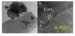 图2异质结构的CeO2/a-Al2O3 7:3复合电解质的 (a) TEM和(b) HR-TEM图及其能带结构势垒的示意图。