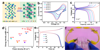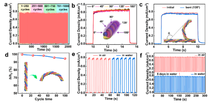 对于光电检测,溶胶-凝胶电解质作为绝缘层,有效地包裹电极并确保最佳载流子传输,同时防止大面积接触的电极之间短路。在可穿戴应用中,FPD对复杂的物理变形表现出良好的抵抗力,并对光信号传输表现出优异的稳定性(在120°下100次弯曲循环后,约为初始值的95.24%)。由于具有优异的钠离子存储能力,ZnHCF@CNTF对电极可以接受大量的光生电子,进一步提高了载流子传输的效率。所得到的FPD实现了151.45mA/W的高响应度和15 ms的快速响应时间。除了光电检测,该集成器件还提供了1.6 V的高放电平台和18.75 mAh cm-3的体积容量。