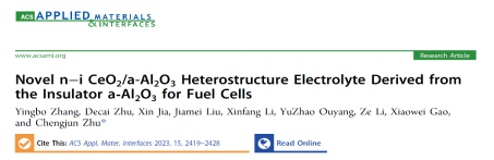再有,朱成军教授课题组在半导体异质结构低温固体氧化物燃料电池领域也取得重要研究进展,相关成果发表在工程材料科学领域国际知名期刊ACS Appl. Mater. Interfaces上,题为 “Novel n−i CeO2/a-Al2O3 Heterostructure Electrolyte Derived from the Insulator a‑Al2O3 for Fuel Cells”(论文链接 http://pubs-acs-org-s.vpn.imu.edu.cn:8118/doi/epdf/10.1021/acsami.2c18240)。