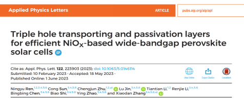 另外,朱成军教授课题组在氧化镍基钙钛矿太阳能电池领域取得了重要研究进展,相关成果发表在物理学类国际知名期刊Applied Physics Letters上,题为 “Triple hole transporting and passivation layers for efficient NiOX-based wide-bandgap perovskite solar cells”(论文链接:https://pubs.aip.org/aip/apl/article/122/22/223903/2893945/Triple-hole-transporting-and-passivation-layers)。