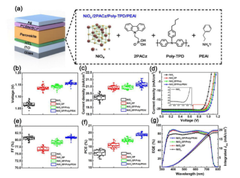 图1(a)NiOX基HTLs的器件结构示意图,(b-f)AM 1.5下的PSC的J-V曲线,(g)在AM 1.5下的IPCE光谱和JSC。