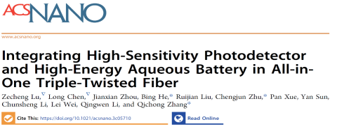近日,太阳成集团tyc122ccvip官网入口朱成军教授课题组在纤维状集成器件领域取得重要研究进展,相关成果发表在纳米领域国际顶尖期刊ACS Nano上,题为 “Integrating High-Sensitivity Photodetector and High-Energy Aqueous Battery in All-in-One Triple-Twisted Fiber”(论文链接https://pubs.acs.org/doi/full/10.1021/acsnano.3c05710)。