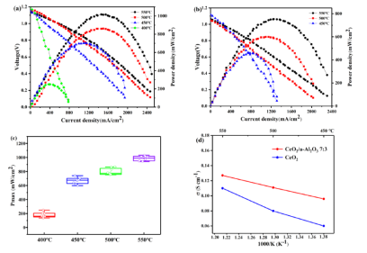 图1带有(a)CeO2/a-Al2O3 7:3和(b)CeO2电解质电池的IV−IP曲线;(c) 不同温度下测量的八个单电池的方框图和(d)CeO2/a-Al2O3 7:3和纯CeO2电解质的Arrhenius图。