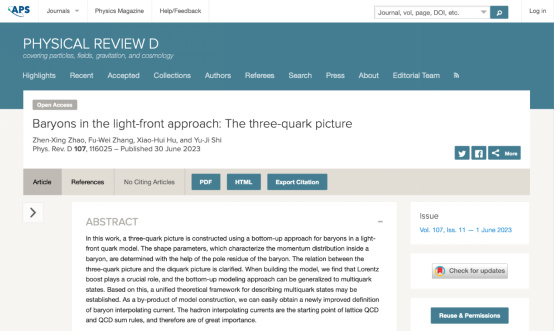 近日,公司赵振兴副研究员在国际物理学著名期刊Physical Review D[科睿唯安最近公布的2022年影响因子为5.0,WOS期刊分区为一区]上以“Baryons in the light-front approach: The three-quark picture”为题发表了在夸克模型领域的最新进展。论文链接:https://link.aps.org/doi/10.1103/PhysRevD.107.116025。