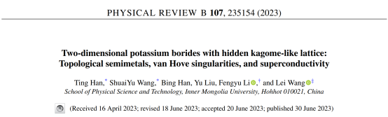 近日,公司李锋钰教授与王磊研究员指导研究生在寻找二维本征拓扑超导材料领域取得新进展,相关成果以“Two-dimensional potassium borides with hidden kagome-like lattice: Topological semimetals, van Hove singularities, and superconductivity”为题发表在物理学知名期刊Physical Review B(《物理学评论B》)上。