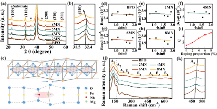 该工作提出一种晶格应变工程策略,将(Mg2/3Nb1/3)3+离子组引入BiFeO3晶格中,通过构建局域金属离子偶极来突破通常情况下铁电、带隙和漏电三者之间的权衡关系,实现光伏性能的有效调控。