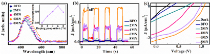 结果表明,通过晶格应变工程使BiFe0.94(Mg2/3Nb1/3)0.06O3薄膜获得了优异的开路电压和短路电流,光电流响应比纯BFO薄膜提高了20倍以上,表现出优异的光伏性能,为提升铁电光伏性能提供了新思路。