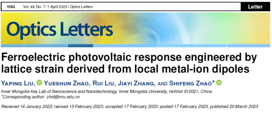 近日,公司赵世峰教授课题组在铁电材料光电转化领域取得新进展,题目为“Ferroelectric photovoltaic response engineering by lattice strain derived from local metal ion dipoles”研究成果在国际光学领域Top期刊《Optics Letters》(《光学快报》)上发表,(论文链接:https://doi.org/10.1364/OL.485829)。该期刊是美国光学学会(Optical Society of America,OSA)旗下物理-光学科学著名国际期刊,1977年创刊,涉及的研究主题覆盖光学科学各个领域,是光学领域最具代表性、认可度高、非常具有口碑的国际权威期刊。这是公司以及内蒙古自治区首次以第一完成单位在该期刊发表学术论文。