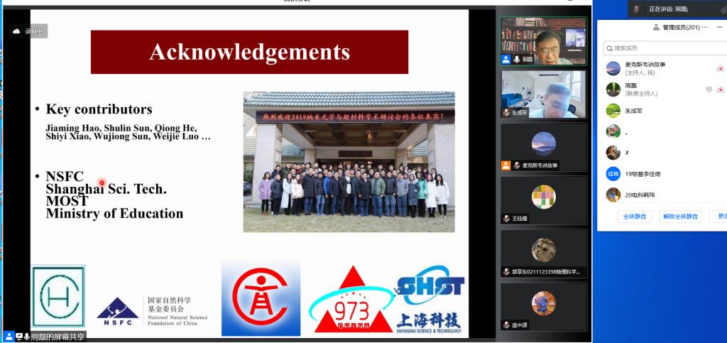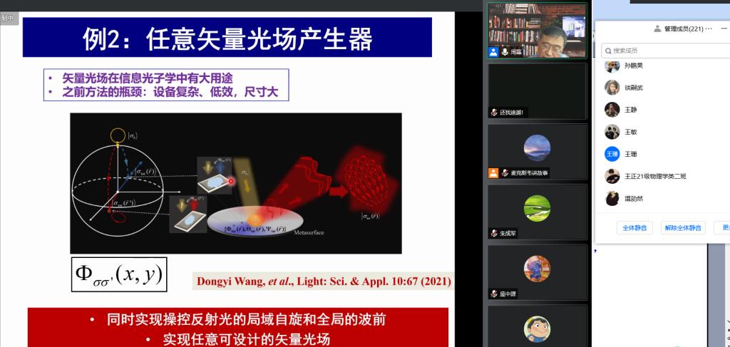 周磊教授立足经典麦克斯韦方程电磁波理论,结合自己的科研历程,简述对电磁波调控的两条分支:超原子、排列序。以相位突变作为核心科学思想,构造超材料、超表面实现电磁波极化、空间、时间依赖的调控,分析其物理机理以及在未来中的应用。其中中美科学家分别独立提出和发展广义斯涅耳理论的原创研究性成果,在广大师生中引起共鸣,催人振奋。报告结束后,周磊教授与师生进行在线提问讨论,对提出的问题进行详细而深入浅出的解答。