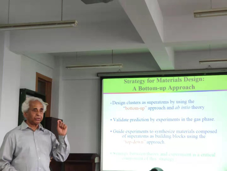 第一场报告由Jena 教授主讲。他首先从上世纪80年代著名的Na团簇质谱和凝胶模型出发,深入浅出的给师生们讲授了团簇的稳定性、幻数、几何结构等基础概念。进而,结合自己的研究成果介绍了“超卤素、飚卤素、超碱金属、超盐、三维元素周期表、团簇组装晶体”等全新的概念,并围绕这些概念系统讲解了超原子团簇的磁性、电子结构、价态、组装以及应用等内容。Jena教授以高屋建瓴的视角,给公司师生们带来了有关超原子的知识盛宴