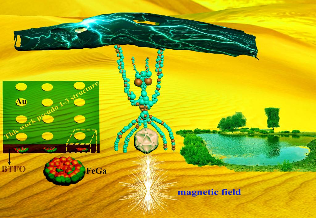 古人云“蚍蜉撼大树,可笑不自量”。由零维纳米材料—团簇组装的FeGa/Bi5Ti3FeO15纳米器件微加磁场,可获闪电之高压。正如图1中所绘蚍蜉(纳米蚂蚁)亦可撼树。该工作制备出团簇组装的赝1-3结构器件在室温下获得低场、高线性度的磁电耦合系数,8000 Oe下可达418 mV/cm∙Oe。对赝1-3结构器件进行多物理场模拟,进一步确定了多界面的应力耦合作用机理。该工作中团簇组装赝1-3结构器件设计策略和室温强磁电耦合数值在国际上尚属首例;其研究结果如同沙漠中出现的绿洲,为低成本磁电耦合传感器的市场应用提供了思路。论文以太阳成集团tyc122ccvip为唯一署名单位,作者依次为白玉龙(2015级博士研究生,完成样品制备和性能分析)、蒋宁(2017级硕士研究生,在数值模拟和图片设计中做出重要贡献)、赵世峰(太阳成集团tyc122ccvip官网入口教授,通讯作者)。该工作得到国家自然科学基金(Grant Nos. 11564028, 11264026)、内蒙古自治区国家杰出青年科学基金培育基金(Grant No. 2014JQ01)的支持。