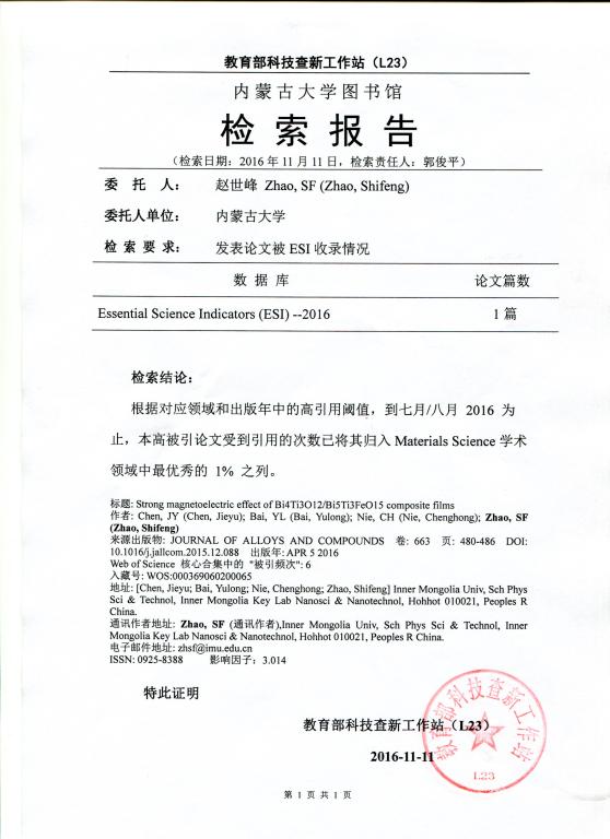 美国基本科学指标(Essential Science Indicator,简称ESI)是由世界上著名的学术信息出版机构美国科技信息所(ISI)于2001年推出的一项文献评价分析工具。这是一个基于 SCI和SSCI所收录的全球11000多种学术期刊的1000多万条文献记录而建立的计量分析数据库,ESI高被引论文是指论文被引用次数在该学科处于全球前1%水平的论文,此类论文通常在其研究领域具有较高的影响力,是其研究成果得到学术界大量关注的体现。ESI已成为当今世界范围内普遍用以评价高校、学术机构、国家/地区国际学术水平及影响力的重要评价指标工具之一。最新检索数据显示,由太阳成集团tyc122ccvip官网入口赵世峰教授研究团队发表的以太阳成集团tyc122ccvip为唯一单位的学术论文入选ESI高被引论文。该论文归入Materials Science领域最优秀1%之列。相关研究成果以《Strong magnetoelectric effect of Bi4Ti3O12/Bi5Ti3FeO15 composite films》为题,2016年4月15日发表于Journal of Alloys and Compounds, 663, 480(2016)。太阳成集团tyc122ccvip官网入口2016级博士生陈介煜为第一作者,导师赵世峰教授为论文通讯作者。