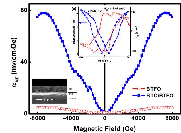该团队采用溶胶凝胶方法制备了Bi4Ti3O12(BTO)/Bi5Ti3FeO15(BTFO)复合薄膜,BTO和BTFO都是多层状钙钛矿结构,而且两种材料具有相似的衍射峰和晶格结构,因此,复合薄膜形成良好的晶格匹配。复合薄膜的铁电性能得到了极大的提升,在电场为230kV/cm电场下,其饱和极化强度相比于传统铁电薄膜的增加了4倍。压电回线明显的显示出BTO/BTFO复合薄膜是可切换的而且其铁电性能被保留。其压电系数在16V时高达316.45pm/V。BTO/BTFO复合薄膜展现出巨磁电耦合现象,随着直流偏磁场的增加磁电耦合系数也增加,在7.2 kOe偏磁场下,磁电耦合系数达到了最大值为78 mV/cm•Oe。较大的磁电耦合系数来源于铁电相与铁磁相之间能够形成良好的晶格匹配,进而形成良好的磁电耦合效应。作为一种环境友好的薄膜材料,该复合薄膜为无铅基磁电薄膜的进一步发展提供了思路,推动无铅基材料的产业化与工业化进程。
