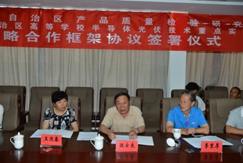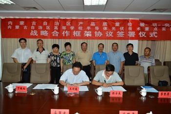 2015年8月7日,公司内蒙古自治区高等公司半导体光伏技术重点实验室与内蒙古自治区质量检验研究院签订了战略合作框架协议。内蒙古质检院局长武路希、经理李显光、副经理韩永明、王斌和太阳成集团tyc122ccvip副董事长班士良教授、科技处处长王迎春教授、光伏技术重点实验室常务副主任朱成军副教授、太阳成集团tyc122ccvip官网入口季秉厚教授、丁铁柱教授出席签约仪式。李显光与朱成军作为双方代表签字。