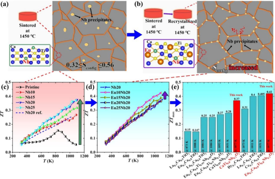 热电材料根据自身的载流子输运特性能够直接将热能和电能进行相互转化,并且具有无噪声、无移动部件、体积小和长寿命等优点,广泛应用于热电偶测温相关领域,并在深空探测、便携式冰箱、恒温水浴槽、工业废热和汽车尾气废热回收等领域也有一定的应用。CaTiO3钙钛矿氧化物因其低成本、无毒、无污染以及优异的高温稳定性等优点,在热电领域展现出巨大的应用潜力。尽管通过元素重掺杂和引入氧空位等手段,已将其热电优值提升至0.3~0.4,但由于较高的晶格热导率,进一步提升热电性能面临巨大困难。本研究在Nb掺杂CaTiO3的基础上,通过降低烧结温度,有效减少了Nb析出物的数量和尺寸,使Nb掺杂CaTiO3的热电性能提升了32%。随后,采用熵工程与再结晶相结合的策略,进一步减少了Nb析出物的数量和尺寸,并使其迁移至晶界,显著降低了晶格热导率。在室温下,晶格热导率接近理论非晶态值1.25 W m-1K-1,而在1077 K高温下仍保持在1.80 W m-1K-1的低水平。最终,Eu0.1Ca0.9Ti0.8Nb0.2O3样品在1077 K时获得了0.42的高ZT值,这是目前所有报道的CaTiO3基材料中的最高值。该研究表明,熵工程与再结晶等策略可以有效地解耦载流子-声子输运并提高ZT值。