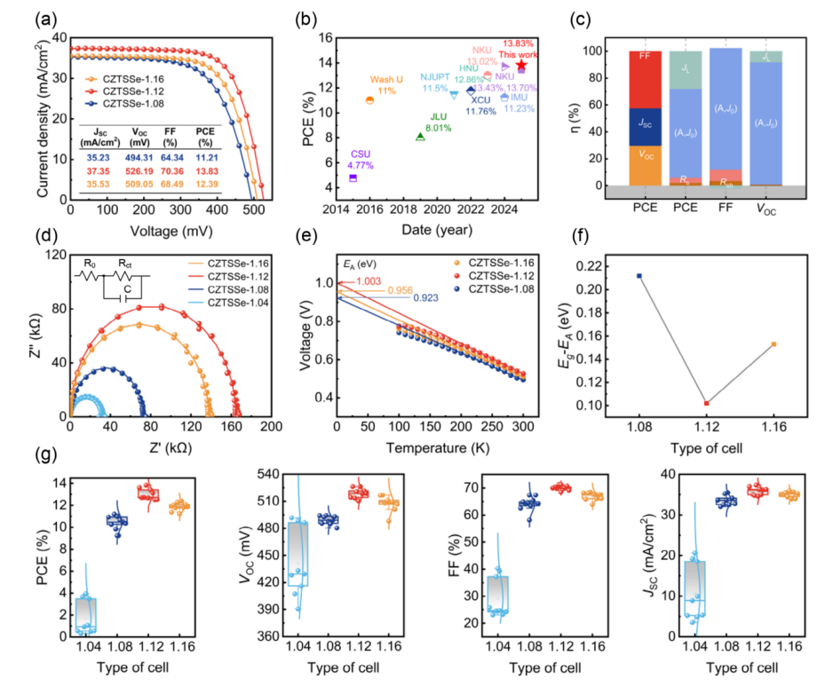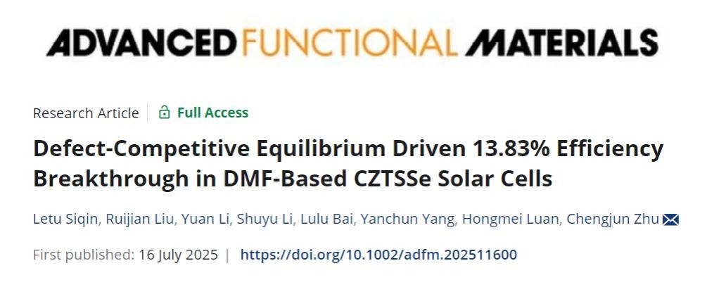 近日,我内蒙古自治区半导体光伏技术与能源材料重点实验室朱成军教授团队在锌黄锡矿铜锌锡硫硒(CZTSSe)薄膜太阳能电池研究领域取得重要研究进展,在国际顶级期刊Advanced Functional Materials(《先进功能材料SCI一区TOP,自然指数期刊,IF19,论文链接:https://doi.org/10.1002/adfm.202511600)上发表题为Defect-Competitive Equilibrium Driven 13.83% Efficiency Breakthrough in DMF-Based CZTSSe Solar Cells的最新研究成果。论文以太阳成集团tyc122ccvip为唯一通讯单位,朱成军教授为该论文的独立通讯作者,物理学博士研究生斯琴勒图为该论文第一作者,刘瑞建讲师和硕士研究生李源为共同一作。