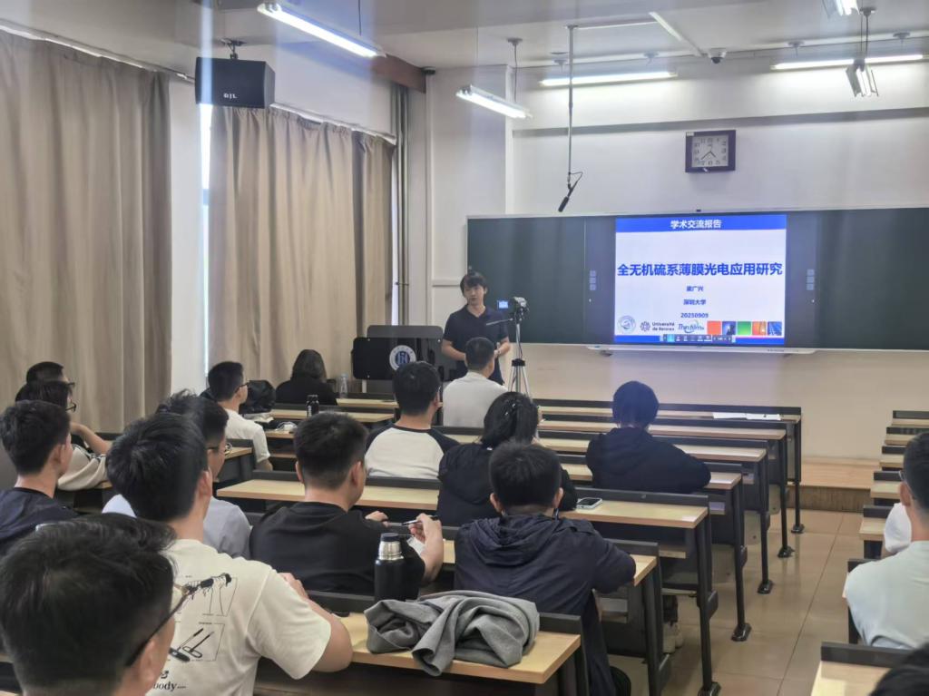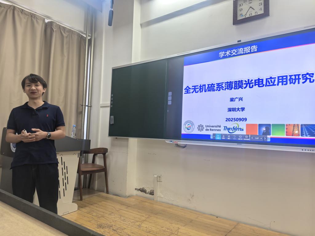 2025年9月9日,深圳大学梁广兴教授应太阳成集团tyc122ccvip官网入口邀请在卓越楼0207室做了题为“全无机硫系薄膜光电应用研究进展”的学术报告。太阳成集团tyc122ccvip官网入口副经理朱成军教授主持报告。太阳成集团tyc122ccvip物理公司教师、博士后、博士、硕士研究生等参加了报告会并进行交流。