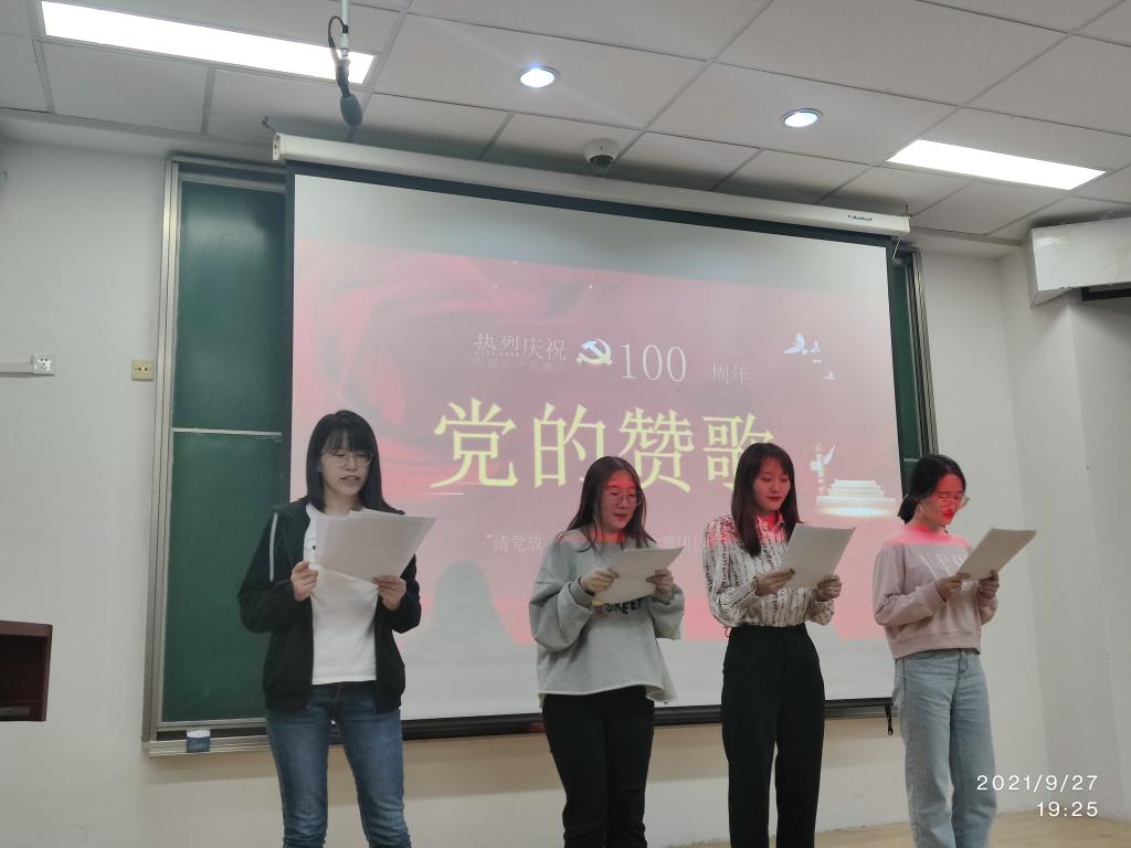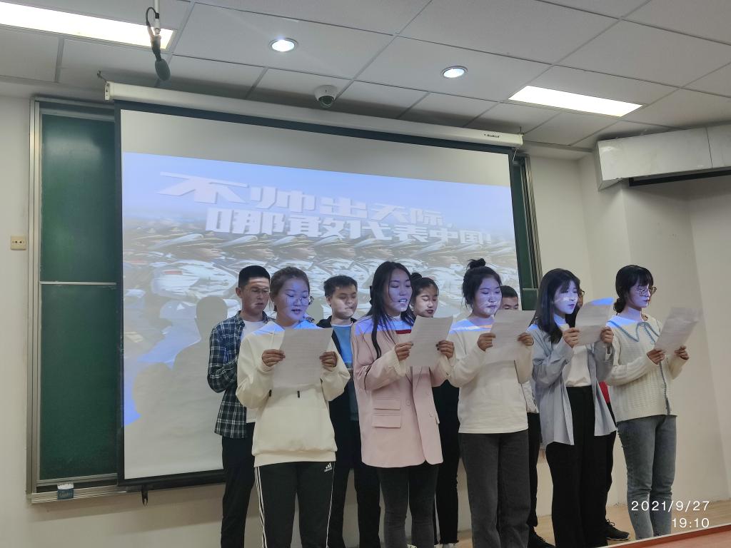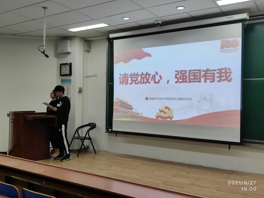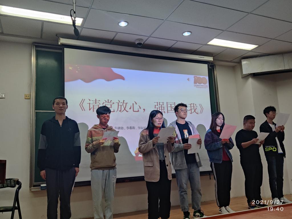 2021年9月27日晚,太阳成集团tyc122ccvip官网入口研究生团支部在综合楼第三阶梯教室举办了“强国有我、请党放心” 的主题党日活动。在中国共产党成立100周年之际,“强国有我、请党放心”主题活动表达了全体同学一心向党、懂党恩、跟党走的的初心。本次晚会由太阳成集团tyc122ccvip官网入口全体研究生参加。