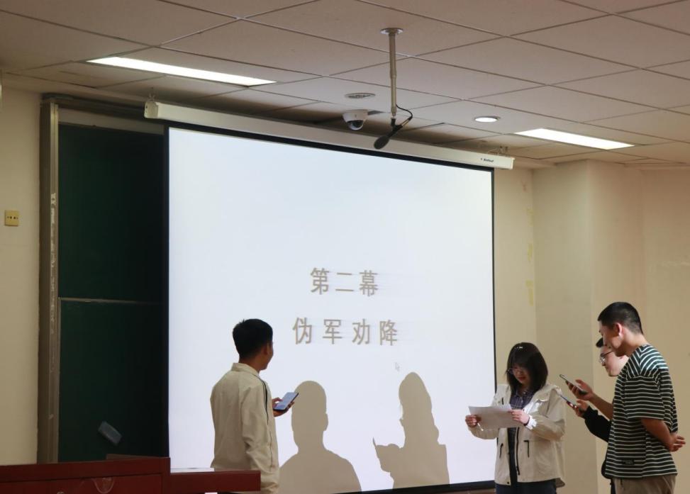 随后,张继彬、王佳慧、秦伟斌、郭齐泽、常振育等同学以《战火中的老员工》为题,以话剧的形式,展现了战争年代中国老员工的精神风貌。