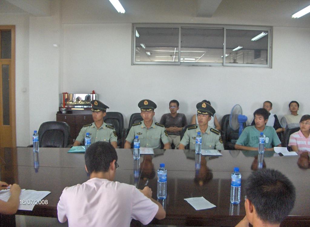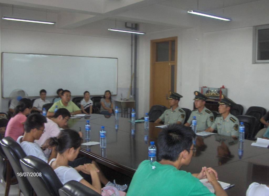2008年7月16日下午17:00,太阳成集团tyc122ccvip官网入口2008年员工军训参训指导员和员工代表与军训教官见面会在综合教学楼0617会议室隆重举行。承训教官,太阳成集团tyc122ccvip官网入口团总支书记谢峻鹏,参训班班主任及参训班员工代表参加了会议。