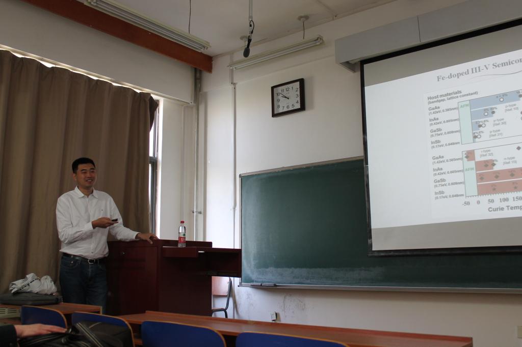 半导体材料作为当今最为重要的一类功能型材料在过去的70年里已经显著地改变了人类社会的生产、生活方式。从简单的晶体管到大规模集成电路,从LED照明到太阳能电池,半导体材料无处不在。今天,全世界经济增长的70%都有赖于半导体工业的发展,而这一比重在可见的未来还将不断增长。张鹏博士在报告中介绍课题组在过去几年中在钙钛矿太阳能电池材料、以及氮化物和氧化物的p型掺杂等领域的最新研究进展。报告后师生与张鹏老师就太阳能电池前景以及半导体材料掺杂等进行交流讨论。