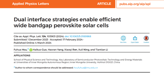 另外,侯福华研究员课题组在宽带隙钙钛矿太阳电池领域取得了重要进展,相关成果发表在物理学类国际知名期刊Applied Physics Letters(自然指数收录)上,题为"Dual interface strategies enable efficient wide bandgap perovskite solar cells" (论文链接:https://doi.org/10.1063/5.0189968)。在该工作中,我院侯福华研究员为第一作者兼唯一通讯作者,太阳成集团tyc122ccvip为唯一完成单位。