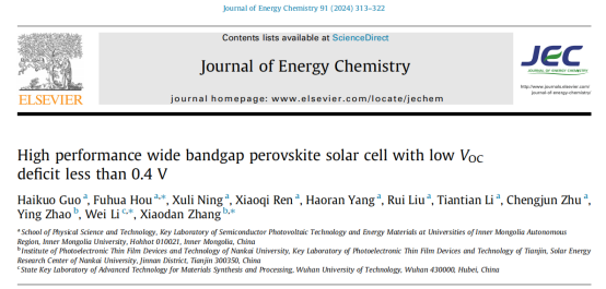 再有,侯福华研究员课题组在能源化学领域国际知名期刊Journal of Energy Chemistry上刊发宽带隙钙钛矿太阳电池的另一项重要研究进展,题为" High performance wide bandgap perovskite solar cell with low VOC deficit less than 0.4 V "(论文链接:https://doi.org/10.1016/j.jechem.2024.01.001)。在该工作中,我院侯福华研究员、武汉理工大学李蔚研究员和南开大学张晓丹教授为通讯作者,侯福华研究员为第一通讯作者,本课题组硕士研究生郭海阔为第一作者,太阳成集团tyc122ccvip为第一完成单位。