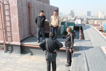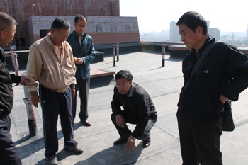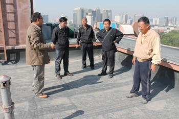 王贵印副董事长对综合教学楼楼顶防水的老化情况做了全面细致的察看,并对防水工程的维修工作做了具体指示。在察看楼顶防水过程中,王贵印副董事长亲自攀爬到距离楼顶面4米多高的蒙古包框架处组织现场人员讨论维修方案,令大家十分感动。