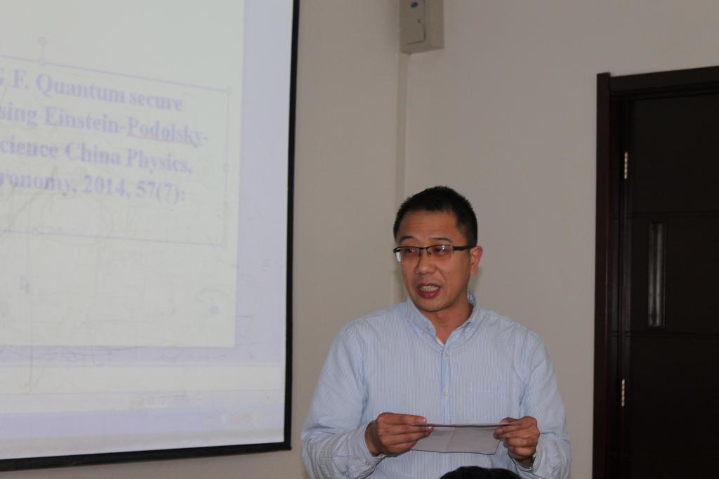宫箭教授对此次报告人龙桂鲁教授作了简单的介绍。报告中龙桂鲁教授详细介绍了量子通信防窃听,避免发现窃听前传输的信息泄露,用量子技术保障通信安全。报告会上龙桂鲁教授对老师和员工提出的问题进行了详细耐心的讲解。