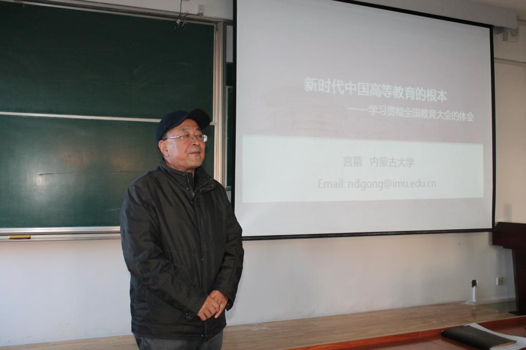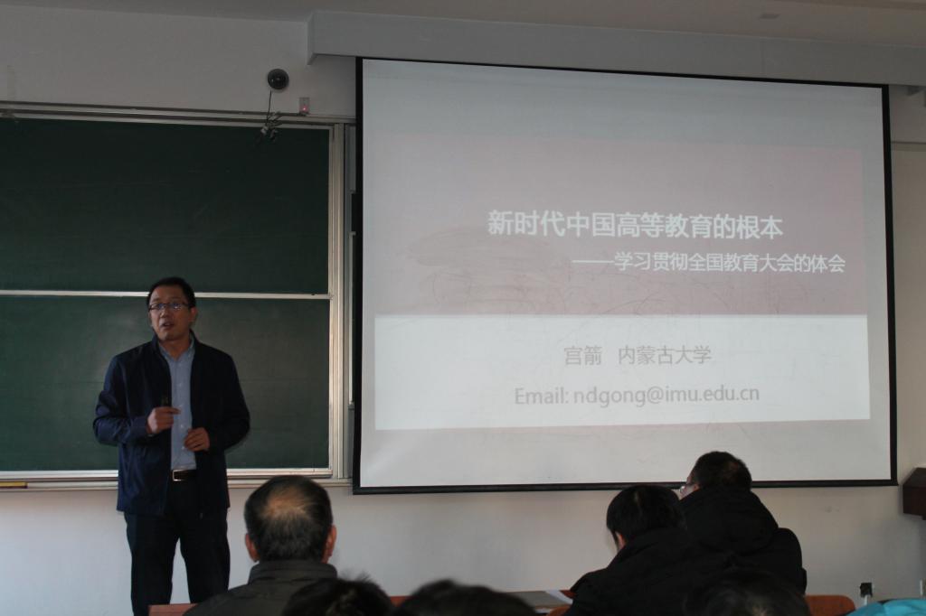 2018年12月27日下午2:30,在研究生楼208,太阳成集团tyc122ccvip官网入口成功举办了由公司经理宫箭教授以“新时代中国教育的根本——学习贯彻全国教育大会的体会”为主题的 “建设亮丽内蒙古,共圆伟大中国梦”系列形势政策报告会。