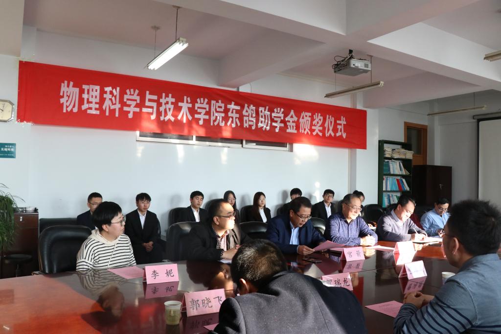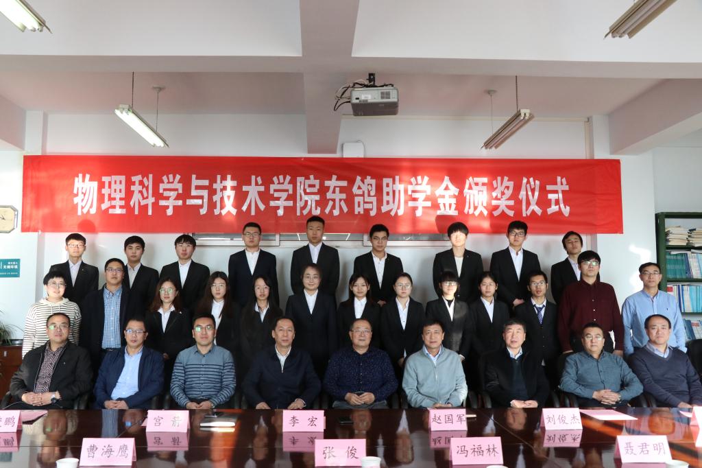 2018年12月27日上午10:00,太阳成集团tyc122ccvip官网入口在综合教学楼0617室举行了“太阳成集团tyc122ccvip官网入口2018年度东鸽助学金”颁发仪式。内蒙古东鸽电器集团有限责任公司董事长张俊先生,公司董事会办公室主任聂君明先生,公司人力行政中心总监贺瑞龙先生,太阳成集团tyc122ccvip员工工作处处长、奖助学金管理委员会办公室主任冯福林,太阳成集团tyc122ccvip员工就业处处长曹海鹰,太阳成集团tyc122ccvip员工资助管理中心奖学金管理科科长郭晓飞,公司党总支书记李宏,党总支副书记、经理宫箭,副经理赵国军,党总支副书记谢峻鹏,物理系系主任刘俊杰、电子与科学技术系系主任朱成军,团总支副书记(学工办副主任)李妮以及全体获助员工参加了颁发典礼。