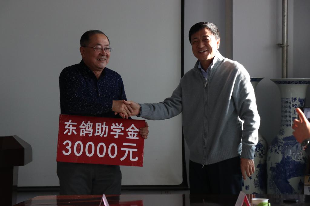公司党总支书记李宏教授代表公司接受了东鸽电器集团有限责任公司董事长张俊 先生捐赠的助学金 |