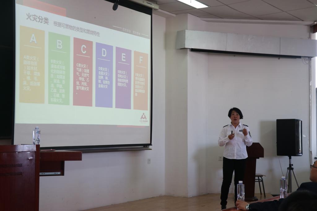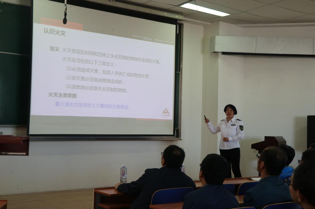 讲座中,刘教官结合实际,针对实验室发生火情时的自救措施做了详细讲解,同时,向大家演示了干粉灭火器、二氧化碳灭火器等几种常用灭火器的使用方法,以及灭火毯、微粒子灭火器等几种新型灭火器的使用方法。