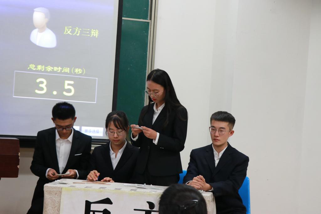 通过初赛的选拔,共有四支队伍进入决赛,他们分别是“超能陆战队”、“发际线总是和我作队”、“你说得不队”和“我们说的都队”。本次辩论赛分为两场进行,各方辩手围绕文化传承和创新的重要性以及人际关系中如何消除矛盾两个辩题展开了缜密而激烈的论辩。比赛过程中,辩手们立足本观点,开展了热烈十足又尽显风度的思想交锋,获得了观众们的阵阵掌声,同时引发了大家对文化传承创新的思考,使观众了解到面对矛盾时不同的态度所产生的不同的结果,从而有了更多解决问题的方法。