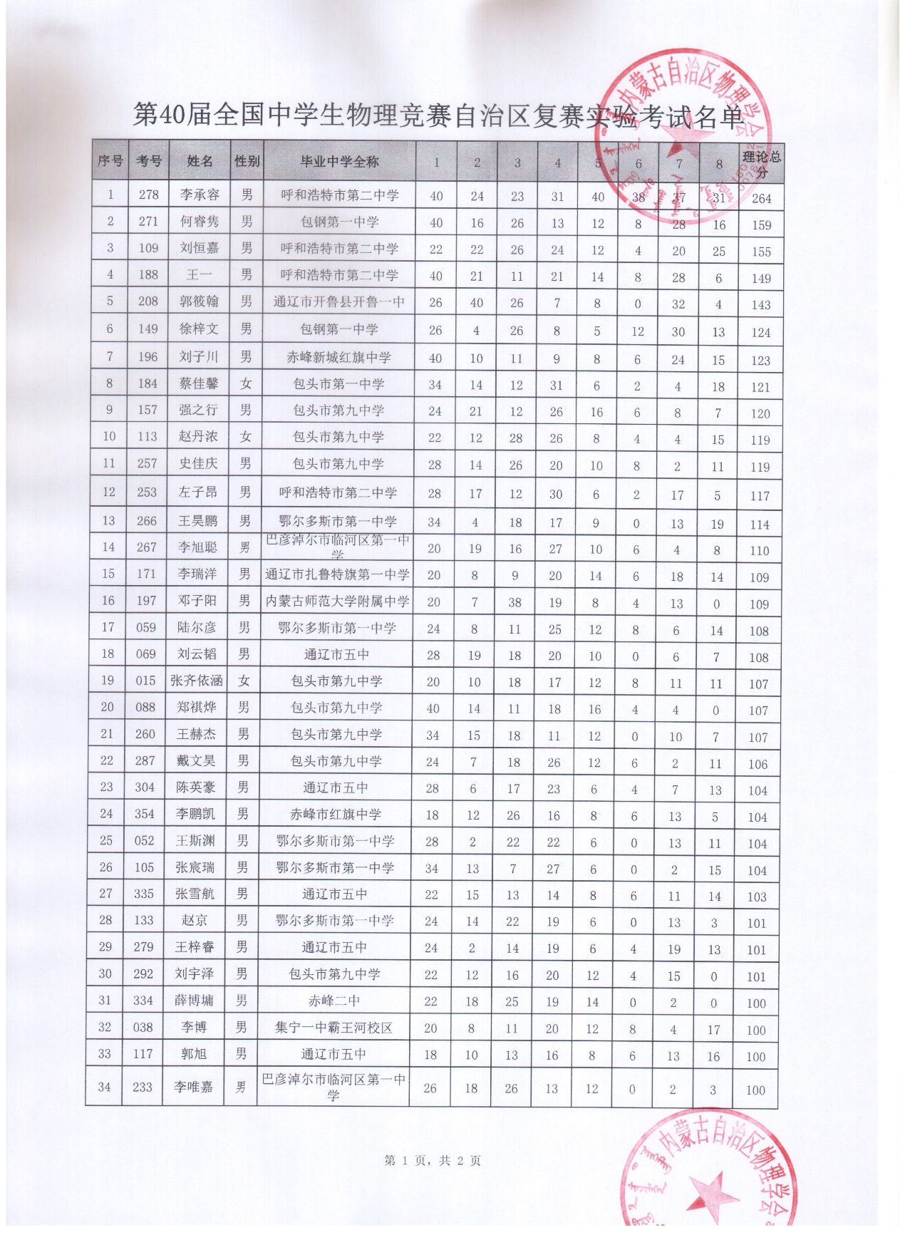 第 40届全国中员工物理竞赛复赛实验考试名单