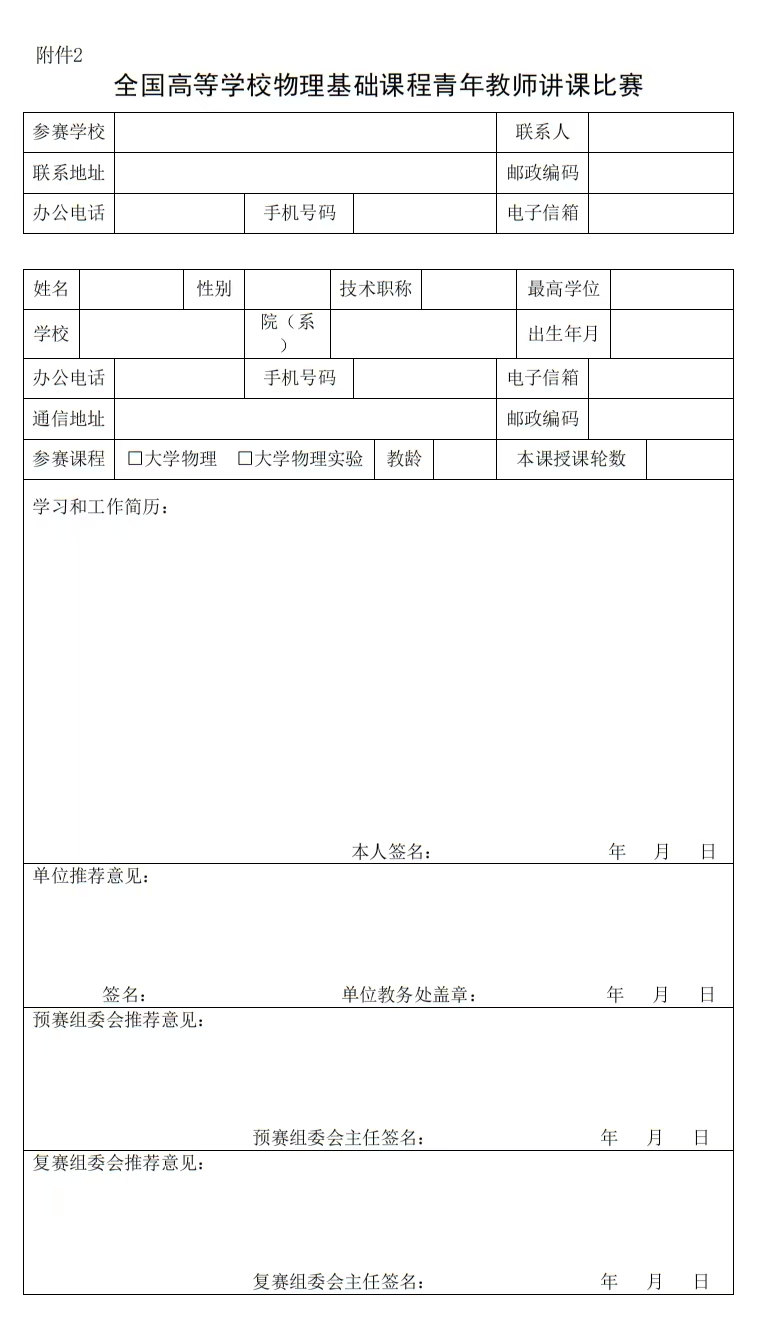 2. 全国高等公司物理基础课程青年教师讲课比赛报名表