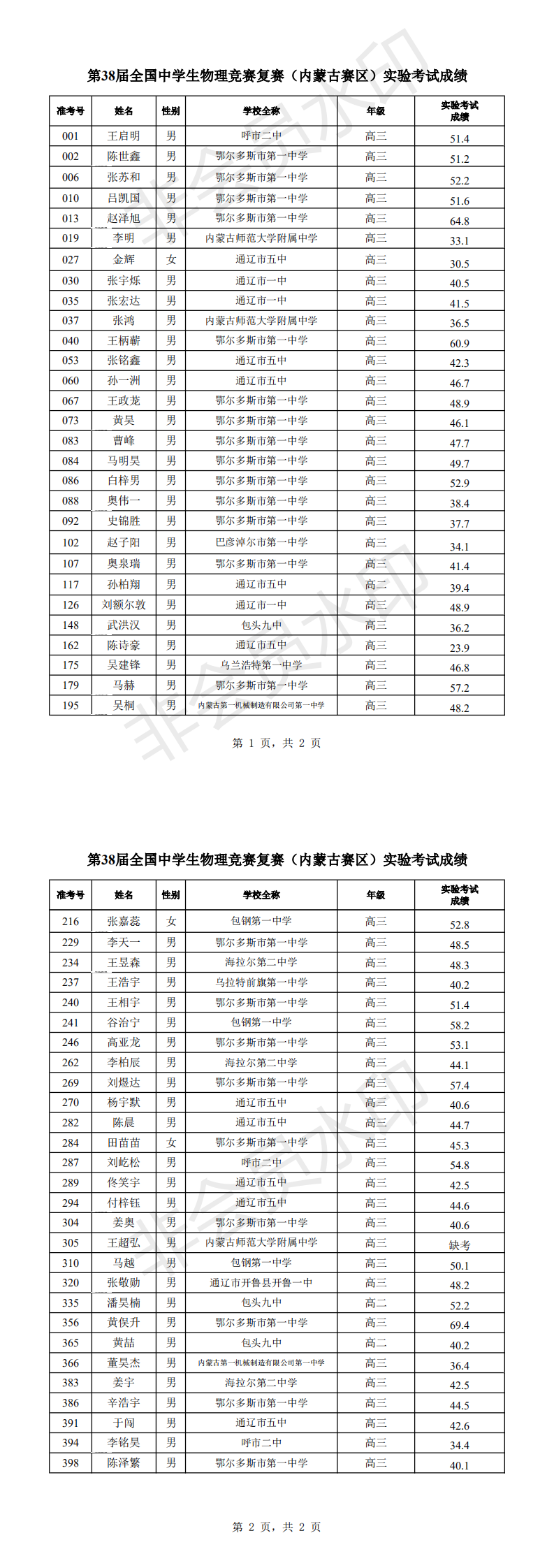 第38届全国中员工物理竞赛复赛(内蒙古赛区)实验考试成绩