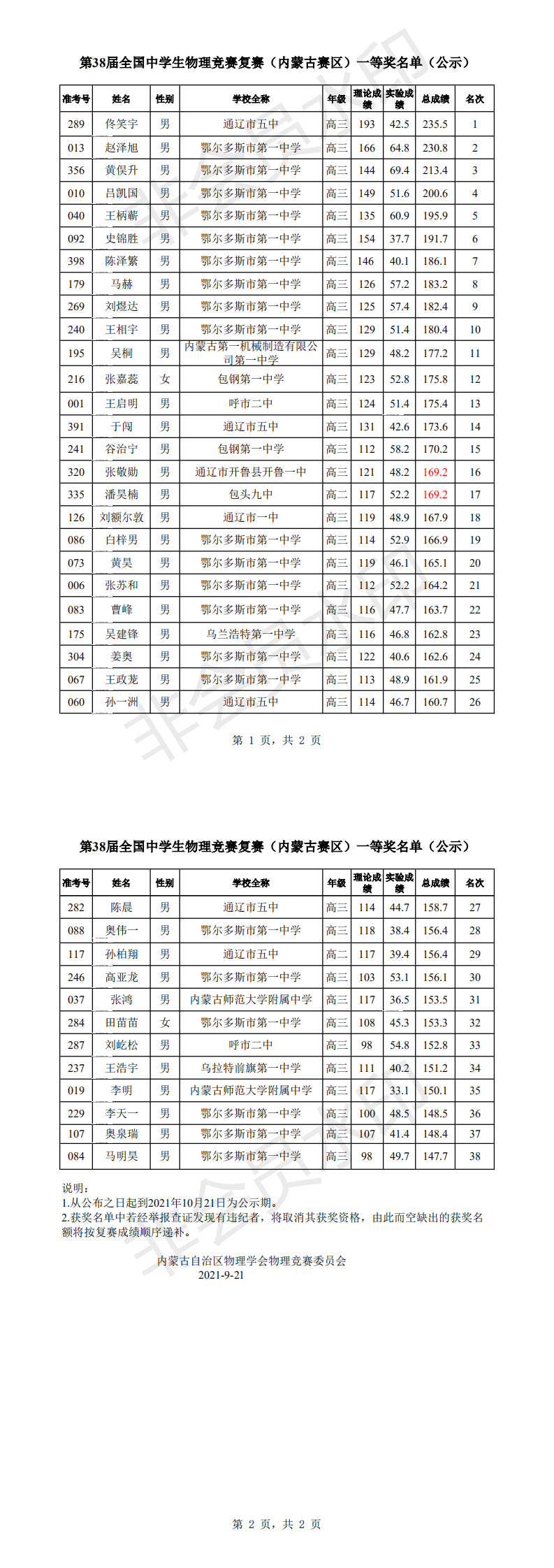 第38届全国中员工物理竞赛复赛(内蒙古赛区)一等奖名单(公示)
